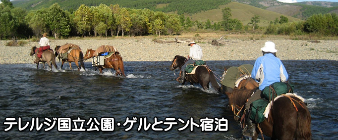 夏期限定の乗馬トレッキング・リピーターの方へオススメコース。山森を馬とともにテントで移送します。季節限定のコース。専用車が同行しません。荷物を馬に載せて運びます。遊牧民、馬方さん、コックさんの3名同行いたします。一日間で20-25キロ乗馬トレッキング。Hagiin Khar湖到着後、フィッシング体験可能。